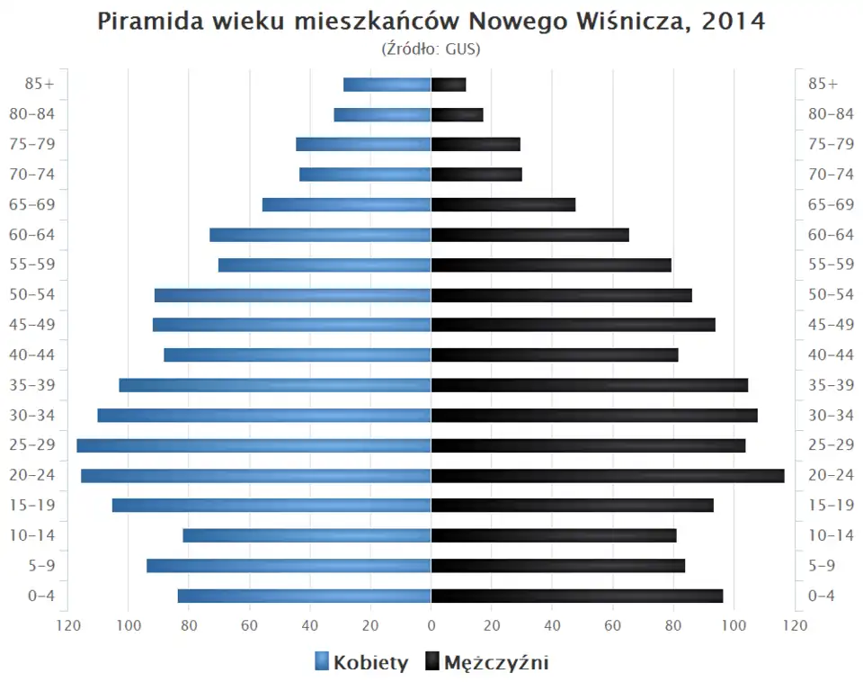 - Piramida wieku mieszkańców Nowego Wiśnicza w 2014 roku[9].