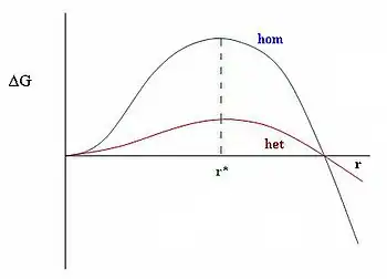 Przy małych promieniach zarodka krystalizacji decydujący wpływ ma człon energii swobodna powierzchni międzyfazowej. Z tego powodu energia swobodna układu wzrasta. Punktem charakterystycznym jest tzw. krytyczny promień zarodka r* znajdujący się na samym szczycie wznoszącej się krzywej. W tym miejscu wpływ energii swobodnej powierzchni międzyfazowej i energii swobodnej objętościowej jest taki sam, a szansa rozpadu lub dalszego wzrostu zarodka jest taka sama. W przypadku dalszego wzrostu embrionu, energia swobodna układu maleje. W celu wyznaczenia krytycznego promienia zarodka należy znaleźć położenie maksimum funkcji ΔG(r).