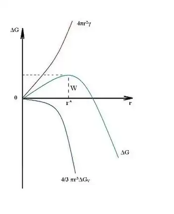 Powyższy model matematyczny można przedstawić w postaci graficznej jak na rysunku 1. Czerwona linia reprezentuje wydatek energetyczny związany z powstaniem granicy międzyfazowej o energii γ (odpowiada za zwiększenie energii swobodnej układu proporcjonalnie do pola powierzchni granicy międzyfazowej – funkcja rosnąca). Błękitna linia reprezentuje powstanie pewnej objętości nowej fazy o energii ΔGV (odpowiada za zmniejszenie energii swobodnej układu proporcjonalnie do objętości kuli – funkcja malejąca). Turkusowa linia reprezentuje sumaryczną zmianę energii swobodnej ΔG spowodowanej powstaniem kulistego zarodka o promieniu r.