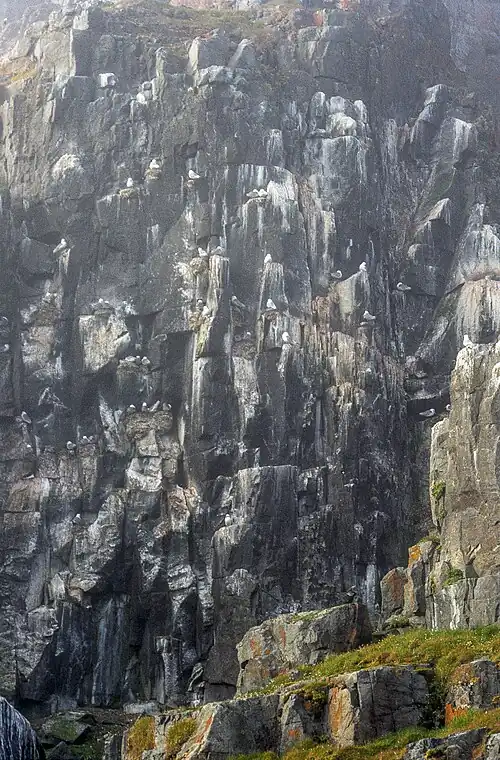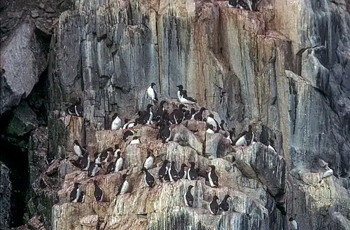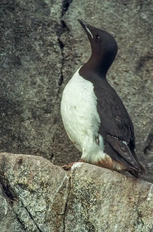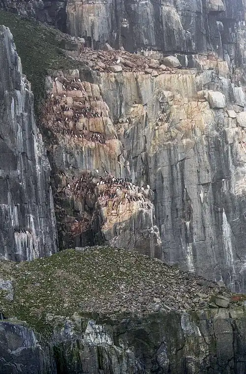 Eksponowane ściany skalne z nieograniczoną liczbą grzęd chronionych przez swą niedostępność przed penetracją przez lisy polarne to idealne miejsce gniazdowania. Występy skalne są zajmowane w marcu i kwietniu. Pojedyncze jaja są składane na nagich półkach po stopnieniu śniegów, w maju lub czerwcu. Okres wylęgania trwa około 30 dni, młode przebywają na półce później jeszcze trzy tygodnie. Rodzice zmieniają się na gnieździe i na zmianę też karmią latorośl. Po tym czasie młode na wpół opierzone i całkowicie niezdolne do latania trzepocąc skrzydłami skaczą ryzykancko w dół, do morza. W tym skoku towarzyszą im ojcowie, którzy są w okresie pierzenia się i też w tym czasie tracą zdolność latania.