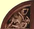 Górne frontowe tablice pokazują Adama i Ewę (odpowiednio po lewej i prawej stronie), oboje zwróceni twarzą do środka. Przykrywają się liśćmi, a Ewa trzyma owoc, który nie jest tradycyjnym jabłkiem, a małym cytrusem. Adam wydaje się wchodzić z zewnątrz obrazu dając wrażenie trójwymiaru.
