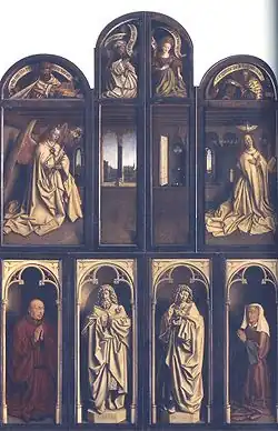 Górne tablice przedstawiają Zwiastowanie. Po lewej widzimy wiadomość archanioła Gabriela, po prawej odpowiedź dana przez Marię (która jest napisana do góry nogami). Spekulowano, czy widok z okna był widokiem z pracowni van Eycka w Gandawie; to mogłoby wyjaśniać, gdzie żył i pracował.