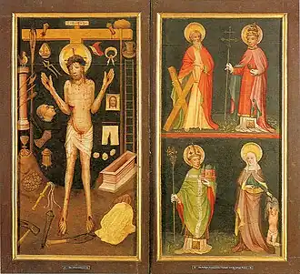 Na rewersie lewego skrzydła został ukazany Chrystus jako Vir Dolorum w otoczeniu arma Christi. Na dwóch strefach rewersu prawego skrzydła umieszczono pary świętych Andrzeja (z krzyżem) i papieża Urbana (w stroju papieskim) oraz Heriberta (w stroju biskupim i modelem świątyni) i Elżbietę (przyodziewająca nagiego żebraka).
