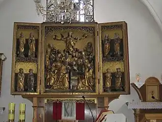 Późnogotycki rzeźbiony pentaptyk szafiasty ze sceną główną Wniebowzięcia NMP w szafie środkowej z 1521 r. jest jednym z nielicznych zachowanych (bez większych zmian) retabulów śląskich. Rzeźby zostały wykonane z drewna lipowego, powleczone zaprawą kredowo-klejową, polichromowane temperą i złocone. Wzory teł i ram wewnętrznych otwarcia wydobyte w zaprawie. Wymiary szafy 215 x 155 cm. Ołtarz w szafie środkowej posiada rzeźby, na skrzydłach wewnętrznych znajdują się płaskorzeźby, zewnętrznych – malowane sceny pasyjne 12 sztuk: Matka Boża Bolesna, Łucznicy, Ogrojec, Naigrawanie, Pojmanie, Upadek pod krzyżem, Chrystus przed Piłatem, Ukrzyżowanie, Biczowanie, Sąd Ostateczny, Chrystus Bolesny, śmierć św. Sebastiana. W zwieńczeniu – rzeźbiona grupa Zwiastowania. Malowidła drugiego otwarcia opierają się na wzorach czerpanych z Małej Pasji Albrechta Dürera (1509 - 1511). W zwieńczeniu na tarczach widnieje rozdzielona data 1525, a w szczycie na tarczy 1895, natomiast na odwrotach popiersi predelli kolejne litery ustalające porządek umieszczenia przedstawień znaczone czarną farbą: E, F, G, H. Wernicke i Lutsch widzieli na tarczach przy scenie Zwiastowania datę 1521, a nie jak obecnie 1525. Nie zachował się baldachim predelli, a także niektóre atrybuty figur w kwaterach wewnętrznych awersów. W październiku 1990 r. skradziono cztery figury z predelli - popiersia świętych. Ołtarz był odnawiany w 1895 r. a w 1966 r. zabezpieczany przez konserwatora Stanisława Filipiaka.