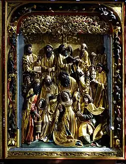 W centralnej części ołtarza znajduje się płaskorzeźba przedstawiająca scenę Zaśnięcia Najświętszej Marii Panny w otoczeniu Apostołów. W skrzydłach bocznych, na awersach, ukazane zostały cztery sceny Męki Chrystusa: w prawym skrzydle u góry znajduje się scena ukazująca Piłata umywającego ręce, zaś u dołu upadek pod krzyżem. W lewym skrzydle u góry umieszczono scena biczowania, a u dołu koronowanie cierniem[3][4]. Na rewersie skrzydeł[a] umieszczono namalowane sceny z życia Matki Boskiej oraz sceny ze Starego i Nowego Testamentu[5]