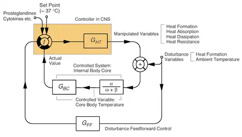 Neurony ośrodka termoregulacji zbierają informację czuciową z termoreceptorów skóry i wysyłają projekcje do mięśni), powodując reakcję termoefektorów i akumulację lub rozpraszanie ciepła, lub zmianę temperatury nastawczej organizmu (tzw. set point) w reakcji na różne substancje zewnątrz i wewnątrzpochodne (neurotoksyny, toksyny bakteryjne, kinetyny, uraz).