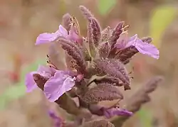 - Grzbieciste, zebrane w 2-6-kwiatowe, oddalone od siebie nibyokółki. Przysadki dłuższe od kwiatów. Kielich dzwonkowaty, owłosiony. Ząbki kielicha jednakowe, kończyste. Korona kwiatu pozornie jednowargowa, jasnopurpurowa, długości 8-10 mm[6].