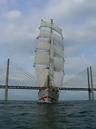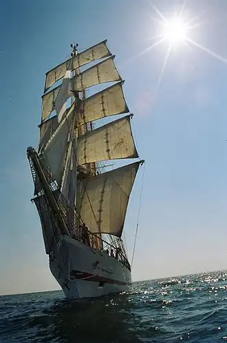 Okręt może żeglować, wykorzystując 24 żagle w różnym zestawie. Są zalecane 4 zestawy ożaglowania: podstawowe, skrócone, sztormowe 1, sztormowe 2. Ożaglowanie podstawowe – wykorzystuje się przy sprzyjających wiatrach do 4 B. Można wówczas dostawić 16 żagli, co daje 958 m². Ożaglowanie skrócone stosuje się przy mniej korzystnych warunkach hydrometeorologicznych, gdy siła wiatru przekracza 5 B: