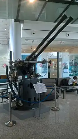 - dwie sprzężone automatyczne armaty przeciwlotnicze kalibru 40 milimetrów Bofors 1937 wz. 36 L/60, chowane w wodoszczelnej studni umieszczonej w zabudowie kiosku. Od armat stosowanego na okrętach nawodnych Bofors 1936 wz. 36 (oznaczenia zacytowane z tabliczek znamionowych dział[68]) różniły się brakiem chłodzenia wodnego, gdyż były chłodzone powietrzem, brakiem stabilizacji poprzecznej i podstawą składaną na czas chowania działa w studzience. Masa działa jest dyskusyjna; podawane jest 2100 kg i 3500 kg, lecz ta druga wydaje się bliższa prawdy. Szybkostrzelność pojedynczego działa wynosiła 120 pocisków na minutę[69]. W razie konieczności użycia, działka wysuwane były hydraulicznie ze studni wraz z obsługą. Zapas amunicji wynosił 1200 sztuk[70]. Podawane w licznych publikacjach informacje, że lufy dział na okrętach podwodnych były krótsze (L/43), okazały się w świetle badań nieprawdziwe[68]. Należy zaznaczyć, że mimo że działa morskie oznaczone były przez Boforsa jako L/60, długość ich luf wynosiła 56 kalibrów[68].