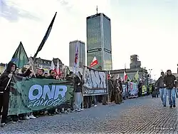 - 11 listopada 2011 – Marsz Niepodległości zorganizowany wspólnie przez ONR i MW zgromadził w Warszawie ponad 20 tysięcy osób. Oprócz wielu grup nacjonalistycznych z różnych organizacji (oprócz ONR także między innymi Młodzież Wszechpolska i Obóz Wielkiej Polski) w marszu wzięły udział różne środowiska prawicowe; monarchistyczne, konserwatywne, konserwatywno-liberalne, republikańskie. Były także liczne delegacje nacjonalistów z zagranicy, między innymi z[43]: Czech, Włoch, Szwecji, Węgier, Ukrainy, Białorusi, Słowacji, Serbii, a nawet Litwy (litewscy niezależni nacjonaliści wsparli pochód, aby zamanifestować swój negatywny stosunek do szowinistycznych tarć na linii Litwa-Polska).