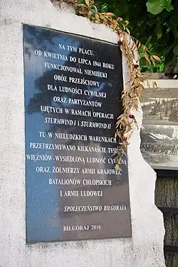 ![]() Pomnik ofiar obozu przejściowego w Biłgoraju: wysiedlanej ludności cywilnej i żołnierzy AK, BCh, AL | |