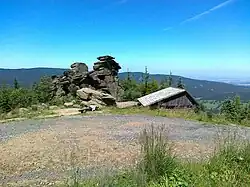 Grupa skalna Obří skály widoczna z niebieskiego szlaku turystycznego prowadzącego na górę Šerák (2011 rok) | |
