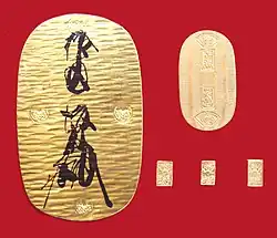 - ↑ Nominalna waga obana wynosiła później zaledwie 90 g, kobana – 18 gramów. W 1725 r. oban miał próbę złota 734, a koban – przeciętnie 564 (Х. Фенглер, Г. Гироу, В. Унгер: Словарь нумизмата. Москва: Радио и связь, 1993 [2-е изд.]).