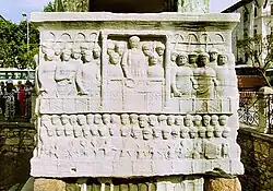 Pod obeliskiem znajduje się cokół z 389. Dookoła wyrzeźbiono w marmurze sceny z życia na Hipodromie: lożę cesarską, stawianie obelisku, dziewczęta tańczące przed turniejami, przedstawienia, wyścigi konne, cesarza przyjmującego daniny.