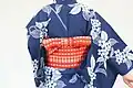 - nagoya obi - w części opasującej talię zszyty na pół, dawniej noszony na co dzień, obecnie do kimon wizytowych;