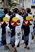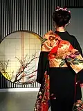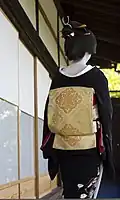 - szeroki na około 50 cm, wykonany z popielatego lub czarnego jedwabiu, wiązany w węzeł i przeznaczony do wizytowego kimona[2].