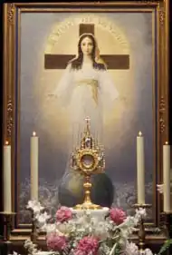 Módl się przed Krzyżem: Panie Jezu Chryste, Synu Ojca, ześlij teraz Ducha Twego na ziemię. Spraw, aby Duch Święty zamieszkał w sercach wszystkich narodów i chronił je od upadku, katastrofy i wojny. Niechaj Pani Wszystkich Narodów, która kiedyś była Maryją, stanie się naszą Orędowniczką[12]