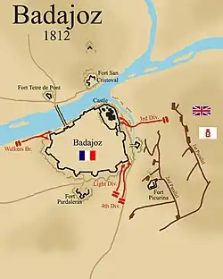 Po zdobyciu granicznych miast: Almeidy oraz Ciudad Rodrigo wojska anglo-portugalskie ruszyły na Badajoz, celem zabezpieczenia linii komunikacyjnych aż do Lizbony, podstawowej bazy operacyjnej wojsk sprzymierzonych. W Badajoz stacjonował garnizon 5 tys. francuskich żołnierzy pod generałem Armandem Philipponem, znacznie lepiej ufortyfikowany i lepiej przygotowany niż te w Almeidzie czy Ciudad Rodrigo. Badajoz odparło dwa oblężenia, dzięki grubym murom kurtynowym, licznym umocnieniom oraz bastionom. Szykując się na trzecie oblężenie Francuzi dodatkowo wzmocnili fortyfikacje i zalali wodą bądź zaminowali przedmurze[3].