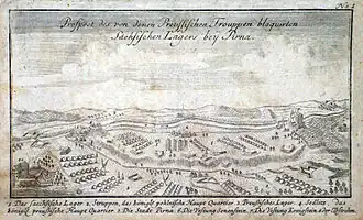 - ↑ Potocznie używana nazwa tego wydarzenia jest nieprecyzyjna i faktycznie myląca, gdyż w rzeczywistości było to oblężenie obozu wojskowego położonego pod miastem, co uwidocznione jest np. w określeniu niemieckim (Belagerung bei Pirna).