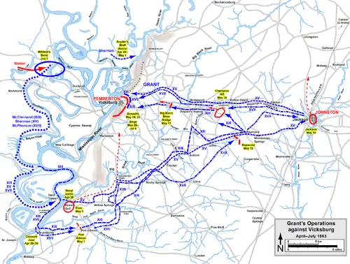 Po przekroczeniu rzeki Missisipi na południe od Vicksburga w Bruinsburg i przemarszu na północnych wschód Grant zdobył Port Gibson i Port Raymond a także zajął 14 maja Jackson, ówczesną stolicę stanu Missisipi, zmuszając tym samym Pembertona do wycofania się na zachód. Próby powstrzymania pochodu wojsk Unii w Champion Hill oraz Big Black River Bridge spełzły na niczym. Pemberton zdawał sobie sprawę iż korpus pod dowództwem generała Williama T. Shermana przygotowywał się do oskrzydlenia go od północy. Dowódca wojsk Konfederatów mógł się wycofać albo pozwolić na to by przeciwnik otoczył go. Pemberton spalił mosty na Big Black River i zabierając po drodze wszystko co nadawało się do jedzenia wycofał się do Vicksburga.