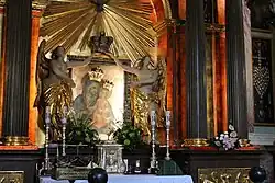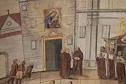 Obraz Matki Bożej na ścianie zewnętrznej kościoła namalowany został najprawdopodobniej w okolicach 1500 r.[1] Wedle przekazu twórcą miał być nieznany z imienia zakonnik, biegły w sztuce malarskiej, zaznajomiony z włoskim renesansem, który zwyczajem przyjętym u karmelitów, namalował obraz na murze przy samych drzwiach od ulicy, aby przychodzący i wychodzący ludzie pokłon czyniąc Rodzicielce Bożej o niej pamiętali[2]. Od początku wizerunek uważany był za cudowny, dla ochrony obrazu wzniesiono w XVI w. kaplicę.