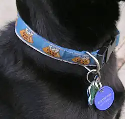 Do umieszczonego na obroży metalowego kółka przypina się również tzw. „numerek” psa, czyli jego identyfikator. Na odwrocie obroży właściciel często wpisuje swój numer telefonu, umożliwiający kontakt z nim w razie odnalezienia przez inną osobę zgubionego przez niego zwierzęcia.