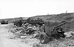 ![]() Niemiecki żołnierz przy zniszczonym wojskowym samochodzie na tle ruin Calais po zdobyciu miasta, koniec maja 1940 | |||