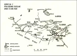 Tymczasem 14 sierpnia 5. Armia rozpoczęła znad rzeki Wkry działania zaczepne przeciwko bolszewickim 3. i 15. Armii[10]. Polskie natarcie zdołało uzyskać powodzenie. Dalekosiężne skutki miał zwłaszcza udany rajd 8 Brygady Jazdy na Ciechanów. Kwaterujący w mieście sztab 4. Armii musiał przystąpić do pośpiesznej ucieczki, tracąc radiostację i dokumenty operacyjne. W rezultacie komandarm Aleksandr Szuwajew stracił łączność z dowództwem Frontu Zachodniego i nie był świadomy pogarszającej się sytuacji ogólnej. Zamiast wesprzeć walczące nad Wkrą 3. i 15. Armie, postanowił realizować pierwotny plan Tuchaczewskiego i skierował znaczną część 4. Armii w kierunku zachodnim[11].