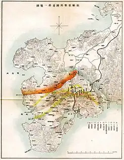 Niebieska linia – 30 lipca, czerwona – 15 sierpnia, żółta – 20 sierpnia 1904, zielona – 2 stycznia 1905
