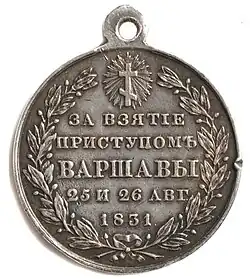 - ↑ Медаль „За взятие приступом Варшавы в 1831 году”. [dostęp 2015-12-01]. (ros.)..