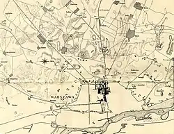 Warszawa umocniona była trzema liniami umocnień, gdzie pierwsza linia najbliżej miasta pokrywała się z linią rogatek miejskich (mniej więcej zarys okopów Lubomirskiego). Wał ten nazywany wałem Newachowicza o wysokości około 3 metrów wzmocniony był szeregiem umocnień stałych. Druga linia wysunięta była na zewnątrz miasta o około 400–600 metrów od pierwszej i składała się z fortów, z których najsilniej umocnione osłaniały szosę kaliską[b]. Najbardziej wysunięta linia polskiej obrony biegła od Szop przez Rakowiec, Wolę, Parysów[c] aż do Wisły. Najsilniej umocnionym punktem było dzieło nr 56 na Woli obejmujące swoją zamkniętą ze wszystkich stron redutą kościół św. Wawrzyńca i przyległy ogród. Reduta ta od czoła była osłonięta lunetą nr 57, a od południa dziełami nr 54 i 55.