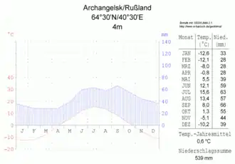 Na terenie obwodu archangielskiego panuje klimat umiarkowany chłodny, na większości obszaru – typu kontynentalnego, na północnym zachodzie, gdzie istnieje pewien łagodzący wpływ Golfsztromu – typu morskiego. W północno-wschodniej części regionu panuje klimat subpolarny. Na obszarze regionu lato trwa krótko i jest chłodne, zaś zima jest długa (na krańcach północno-wschodnich nawet 250 dni) i mroźna, z silnymi wiatrami. Średnia temperatura powietrza w styczniu to ok. –26 °C (cieplej na północnym zachodzie, chłodniej na północnym wschodzie), zaś lipca – +15 °C (cieplej na południu, chłodniej na północy i wybrzeżach). Zimą temperatura potrafi spadać poniżej –50 °C; najniższa temperatura zanotowana w samym Archangielsku, gdzie nie jest najchłodniej, to –45,2 °C. Niekiedy latem bywa nawet powyżej +30 °C (w Archangielsku najwyższa zanotowana temperatura to +34,4 °C).