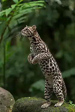 Ocelot nadrzewny[23], margaj[24][25] (Leopardus wiedii) – gatunek drapieżnego ssaka z podrodziny kotów (Felinae) w obrębie rodziny kotowatych (Felidae). Mniejszy od ocelota wielkiego, osiąga do 79,2 cm długości głowy i tułowia, ogon do 51,8 cm. Waży od 2,3 do 4,9 kg. Grube i miękkie futro barwy od szarej do cynamonowej zdobią plamki barwy ciemnego brązu czy też czerni, brzuch biały. Zwierzę wiedzie samotny tryb życia w lasach Ameryki Środkowej i Południowej. Jest lepiej przystosowany do nadrzewnego życia niż inne oceloty, aczkolwiek poluje najczęściej na ziemi, głównie na małe ssaki. Nie poznano dobrze rozrodu, samica rodzi najczęściej jedno kocię. Pomimo objęcia gatunku ochroną polowania – głównie celem pozyskania skór – nie ustały.