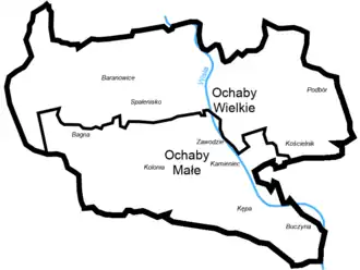 - Ochaby Wielkie (identyfikator SIMC: 0999713) – północna część sołectwa, 914 z 2016 mieszkańców, części miejscowości: Baranowice (0067346), Kościelnik (0067398), Podbór (0067406), Spalenisko (0067412);
