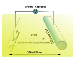 Ochrona rurociągów podziemnych lub podwodnych polega na zastosowaniu zewnętrznego źródła napięcia (prostownik) i anod ochronnych, rozmieszczonych w pobliżu (zamknięcie obwodu elektrycznego przez elektrolit)[1][10]
