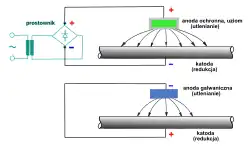 - stosując zewnętrzne źródło napięcia (ochrona katodowa elektrolityczna)