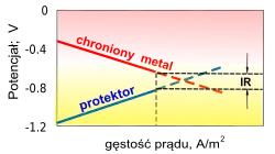 Metal, którego stan określa punkt leżący w obszarze korozji, można ochraniać zmieniając jego potencjał elektryczny i kwasowość środowiska.
