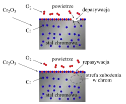 Chemiczna odporność metali konstrukcyjnych i powłok metalicznych na działanie agresywnego środowiska jest często spowodowana pasywacją – powstawaniem szczelnych warstw produktów reakcji z czynnikami agresywnymi (np. tlenków). Takie warstwy ochronne powstają np. na stopach aluminium lub stali zawierającej takie dodatki stopowe jak chrom, krzem, aluminium.