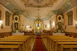 - rokokowy ołtarz główny z końca XVIII wieku z obrazem Matki Boskiej Śnieżnej oraz postaciami fundatorów (1637)[9]