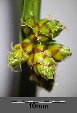 - Zebrane w 5-10 kłosów, te z kolei zebrane w główkę o średnicy ok. 1 cm z długą, odgiętą podsadką. Przysadki ostre. Okwiat złożony z 6 szczecinek. Słupek z trzema znamionami, trzy pręciki[8].
