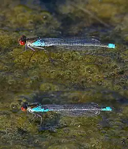 i mniejszej (Erythromma viridulum) – u dołu. Różnice widoczne są w ubarwieniu 8. segmentu