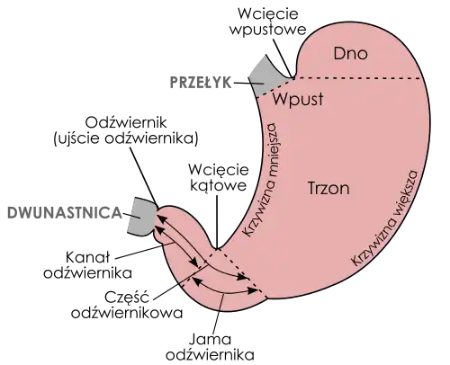 - zwężenie odźwiernika u dorosłych – może być powikłaniem choroby wrzodowej zlokalizowanej blisko odźwiernika, której gojenie się prowadzi do powstania blizn, zwężających światło czasem nawet do kilku milimetrów; jest to często przyczyną rozszerzenia żołądka, wymiotów, odwodnienia oraz tworzenia nowych wrzodów; powodem zwężenia może być także nowotwór.