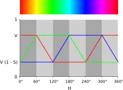 Należy zauważyć, że w każdym przypadku we wzorze znajduje się ułamek gdzie W to największa wartość z R, G, B; M to najmniejsza, a S to wartość między dwiema pierwszymi.