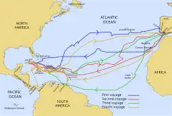 12 października trzy statki, z flagową „Santa Marią” na czele, dotarły do brzegów wyspy San Salvador w archipelagu Bahamów, którą uznano za jedną z wysp japońskich. Po opłynięciu kilku innych wysp, w tym Kuby i Haiti w archipelagu Wielkich Antyli, Kolumb powrócił do Hiszpanii i został przyjęty z gorącym entuzjazmem w Barcelonie. Zorganizował potem jeszcze trzy dalsze podróże ekspedycyjne. Dwie ostatnie dotarły do wybrzeży Wenezueli oraz Hondurasu i Panamy, które według odkrywców miały być kontynentem azjatyckim. Dopiero podróżujący do Ameryki Południowej 20 lat później żeglarz florencki Amerigo Vespucci stwierdził jako pierwszy, że odkryte przez Kolumba lądy to nie Japonia i inne części Azji, lecz nowy, nieznany dotąd kontynent. Nazwano go od jego imienia Ameryką.