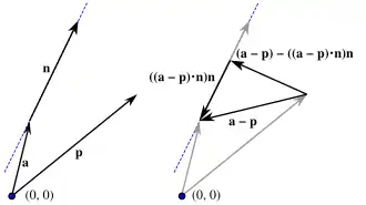 Wzór ten stosuje się w dowolnej liczbie wymiarów. Skonstruowany został geometrycznie następująco: jest wektorem od danego punktu p do punktu a na prostej. Zatem jest długością rzutu tego wektora na daną prostą (kropka reprezentuje tu iloczyn skalarny wektorów) i wobec tego
