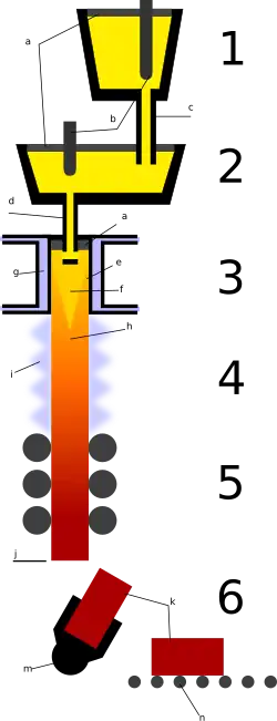 W procesie produkcji płynny metal, najczęściej stal o temperaturze około 1550 °C, wlewany jest pod kontrolą z kadzi do przelotowej wlewnicy - krystalizatora, gdzie krzepnąc uzyskuje kształt tej formy i jest sukcesywnie z niej wysuwany. Opuszczający maszynę odlew stalowy ma temperaturę około 1000 °C i jest długim blokiem, który po pocięciu przekazywany jest do dalszej obróbki w walcowni.