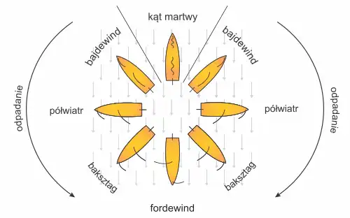 Przykład: Jacht znajduje się w półwietrze lewego halsu. Aby odpaść do baksztagu sternik wychyla płetwę sterową w prawo, powodując skręcanie jachtu.