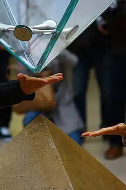 Masa piramidy wynosi 30 ton. Jej wierzchołek zawieszony jest około 140 cm nad ziemią, a pod nim znajduje się mała piramida kamienna. Wierzchołki piramid prawie dotykają do siebie. Tafle szklane o grubości 3 cm łatwo rozszczepiają światło słoneczne dając tęczowe refleksy na posadzce.