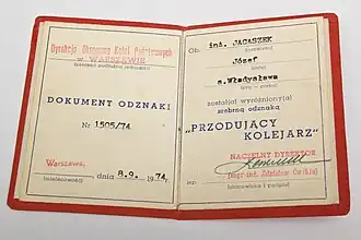 - ↑ Zarządzenie Ministra Komunikacji z dnia 22 kwietnia 1961 r. w sprawie zmiany regulaminu odznaki "Przodujący Kolejarz" (M.P. z 1961 r. nr 43, poz. 199)