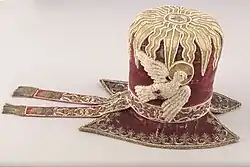 Aksamitny kapelusz, o wysokiej główce w formie walca, lekko rozszerzającego się ku górze, ma formę zgodną z modą XVII wieku. Na jego szczycie znajdowało się kiedyś niewielkie zwieńczenie w kształcie „szyszki”. W miejscu jej osadzenia zachował się ślad lakowej pieczęci. Zarówno krawędzie ronda, jak i główkę kapelusza oraz atłasową wstęgę, która ją otacza, pokrywa haft wykonany perłami oraz srebrnymi i złoconymi nićmi. Do wykonania widocznej na kapeluszu figury gołębicy, symbolizującej Ducha Świętego, użyto pereł. Detale uzupełniono rubinami. Nimb Gołębicy i dekorację w formie „słońca” z promieni spływających ze szczytu główki, wykonano z obfitym użyciem złota. Na zakończeniach wstęgi zdobiącej kapelusz widnieją kartusze z herbami Odescalchi. Puchary, elementy herbu Innocentego XI, powtarzają się też przy rozcięciach ronda[1].